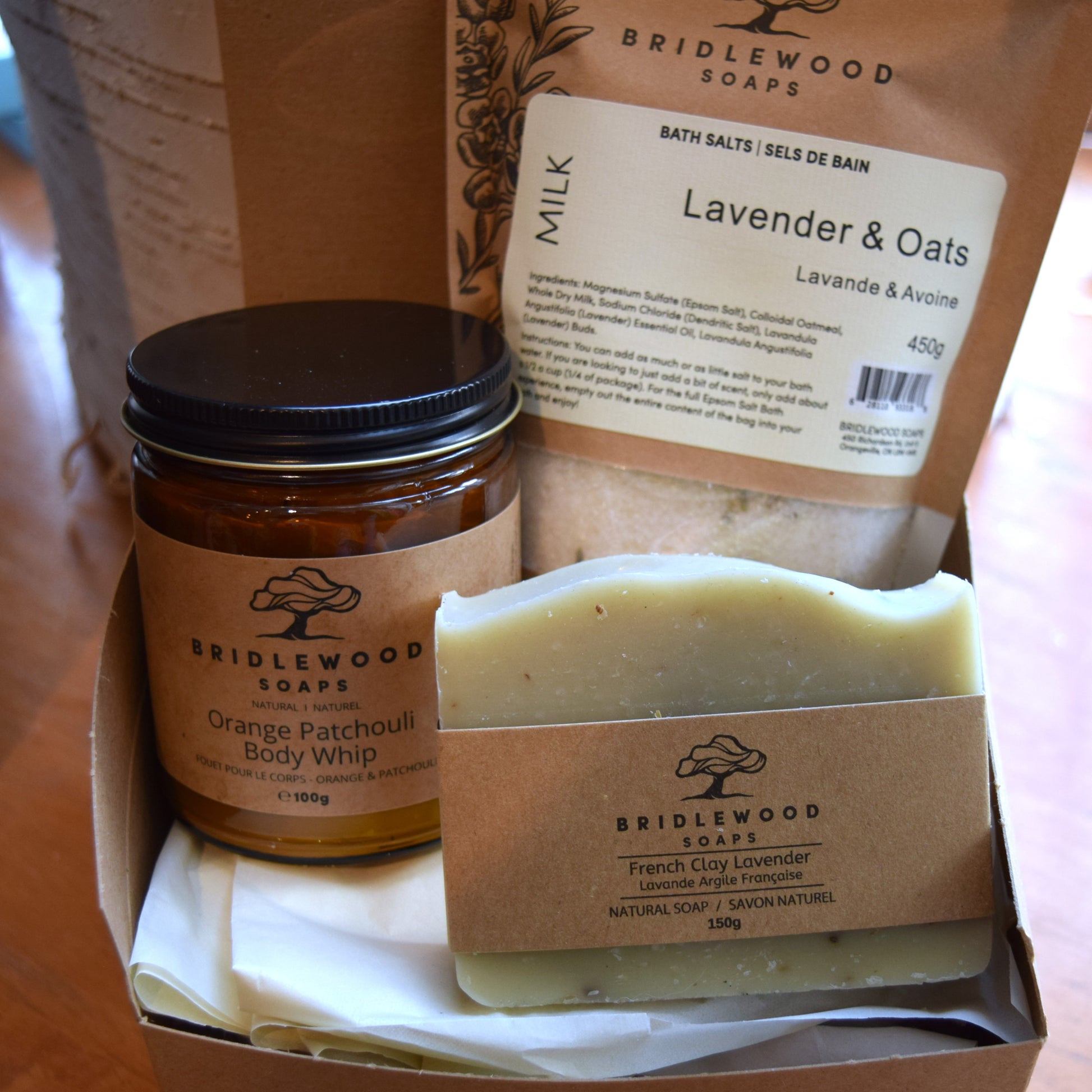 Handmade orange/patchouli body whip, lavender saop and lavender/oats bath salts.