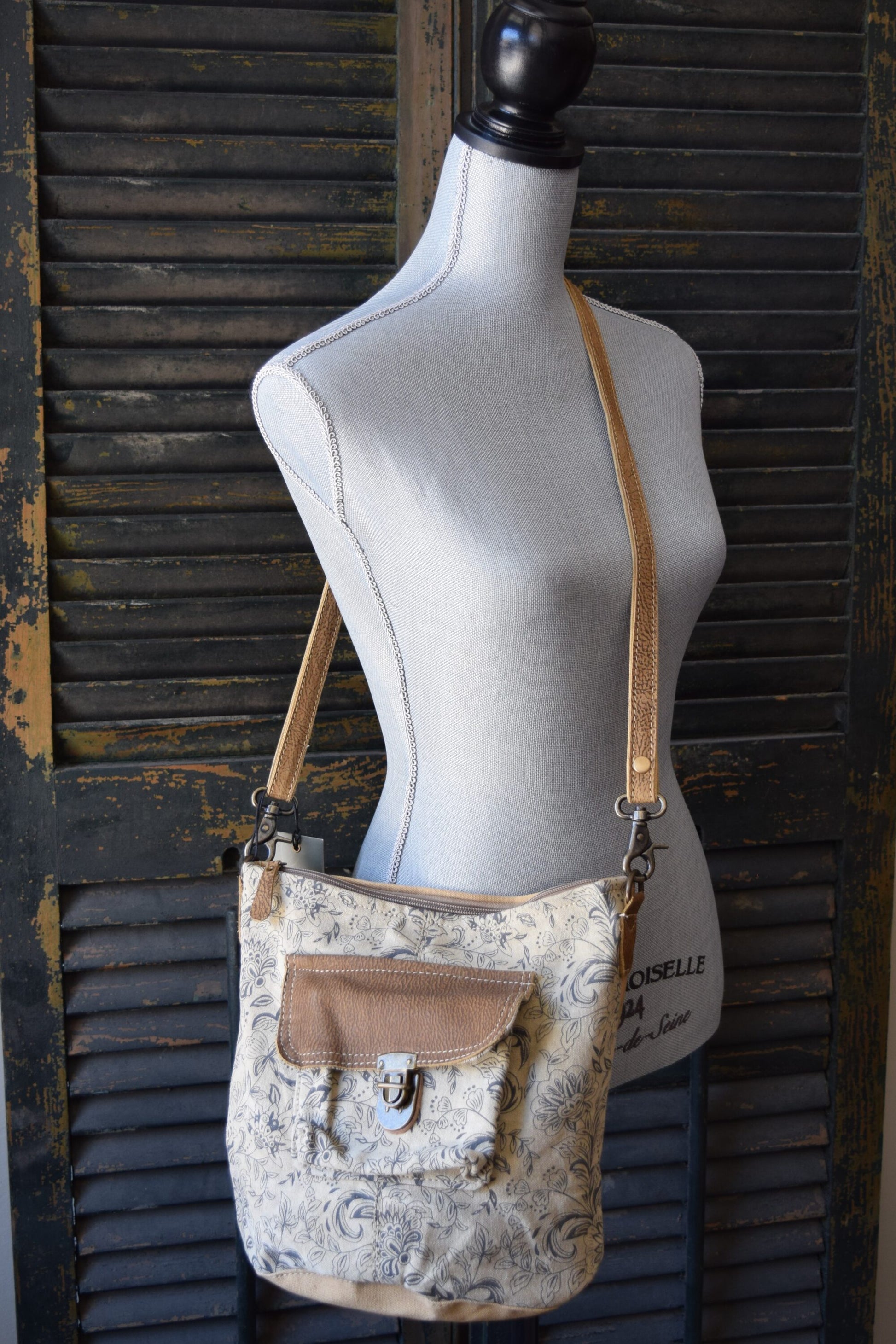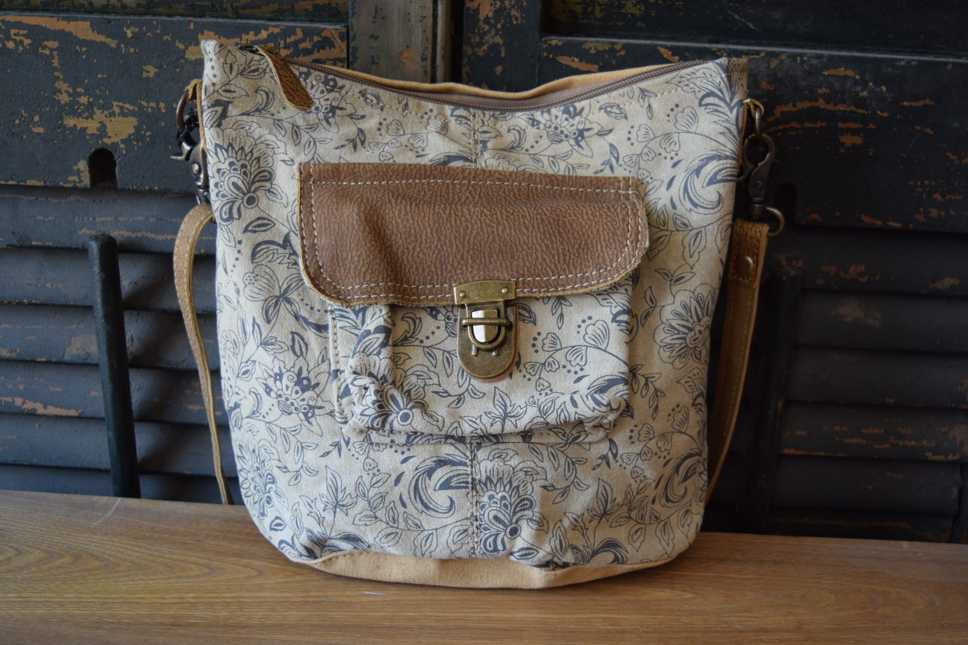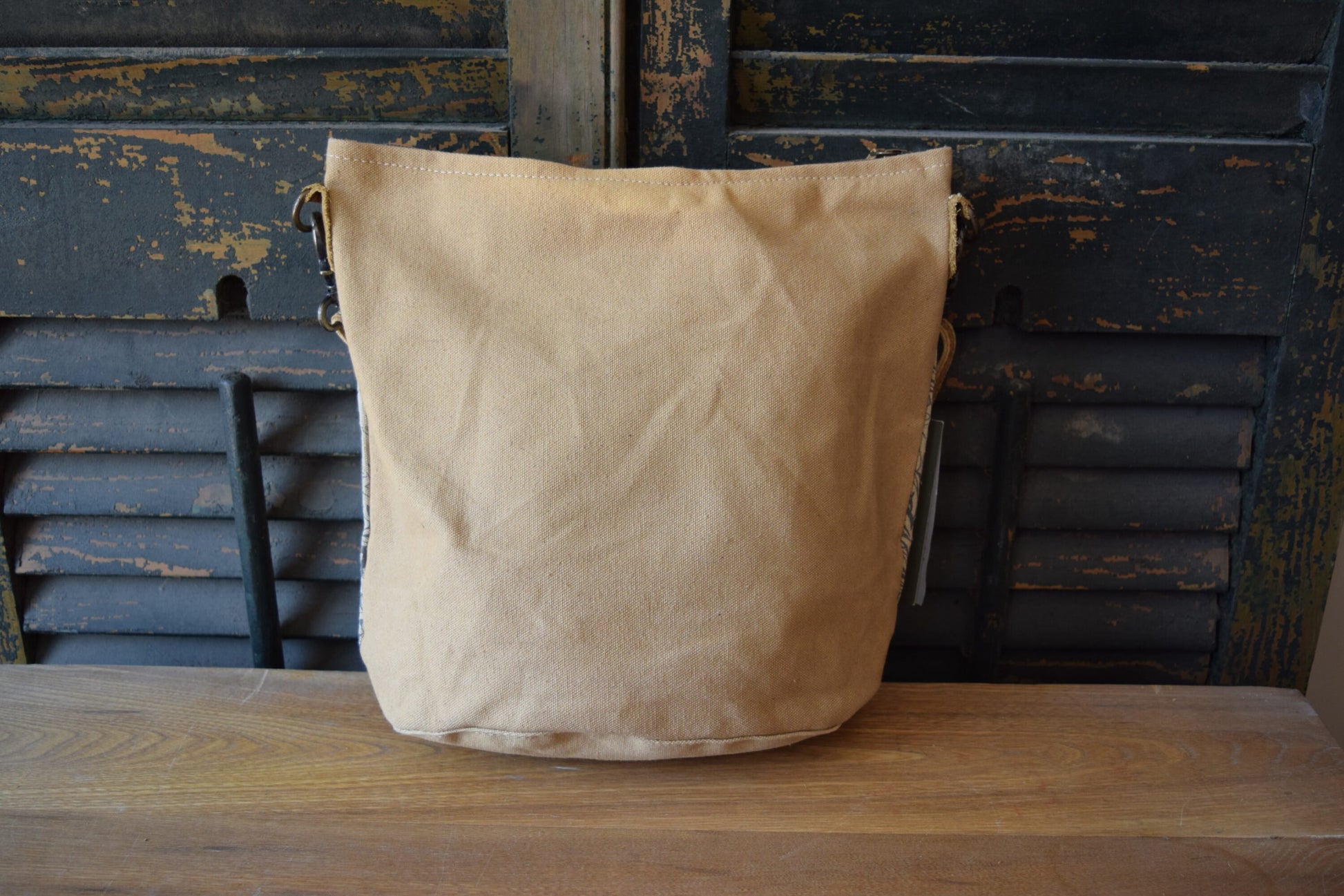 Handcrafted and repurposed from army tent canvas and carpet remnants and high-quality genuine leather. Size: 14" x 10.5" with a 22" leather strap.